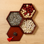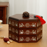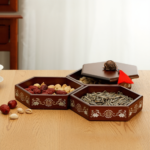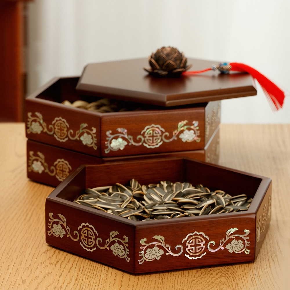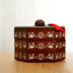 This snack box is meticulously crafted using the non-heritage lacquer and mother-of-pearl inlay technique. Natural lacquer, derived from the lacquer tree and applied in numerous layers, bestows upon the box a durable quality and an antique, elegant charm. The mother-of-pearl inlay involves selecting vibrantly colored natural shells, which undergo intricate processes of cutting, grinding, polishing, and inlaying to delicately present the patterns. Each piece of mother-of-pearl is imbued with a soul, shimmering with a captivating luster on the box’s surface, beautifully contrasting with the deep base color to create a luxurious and dignified visual effect.