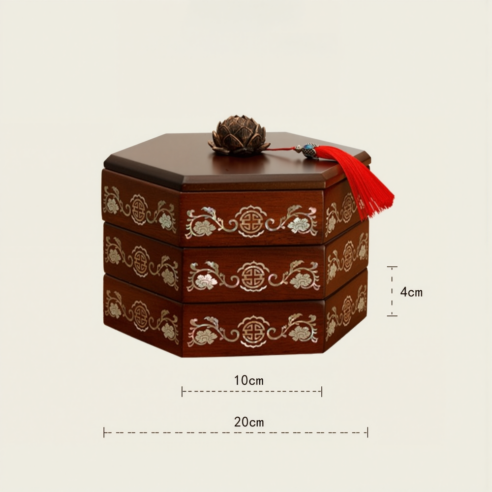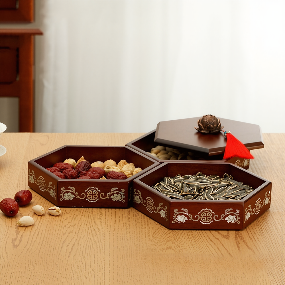The Auspicious Peony & Longevity Pattern Lacquer Mother-of-Pearl Inlay Snack Box with Dividers is akin to an artistic treasure embodying traditional auspicious culture, deeply rooted in the ancient and brilliant soil of Eastern civilization. With unique ingenuity, the designers have skillfully integrated the intertwined peony and the shou (longevity) pattern, two highly representative traditional auspicious motifs, allowing millennia of cultural heritage to re-bloom with contemporary splendor in modern life.
