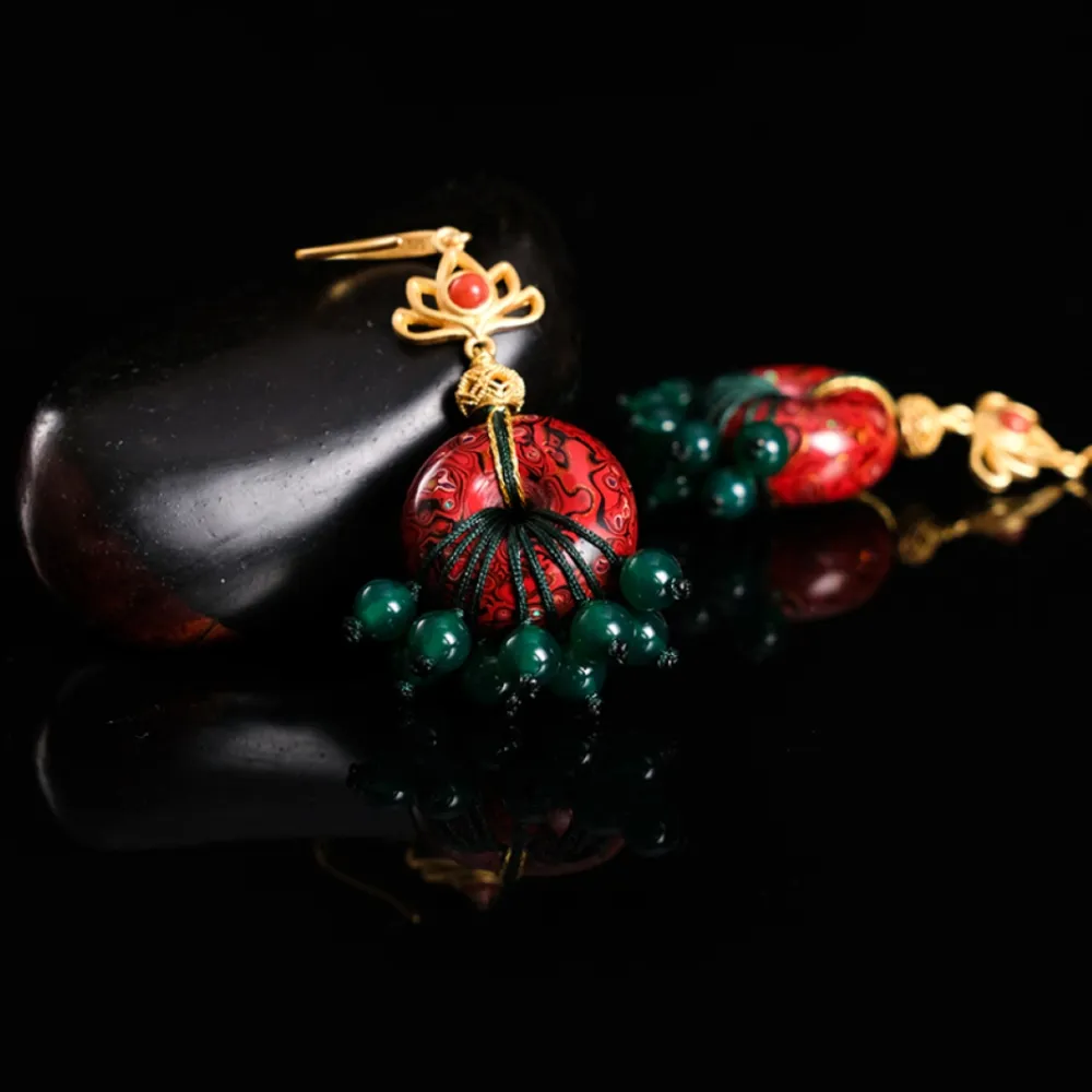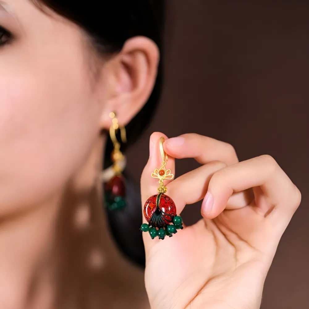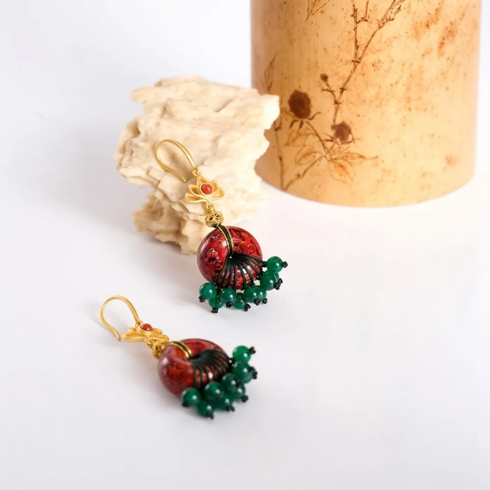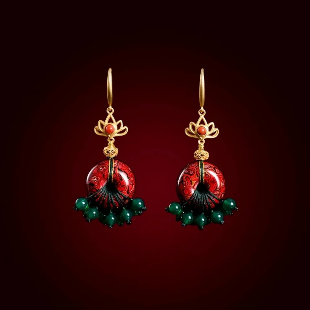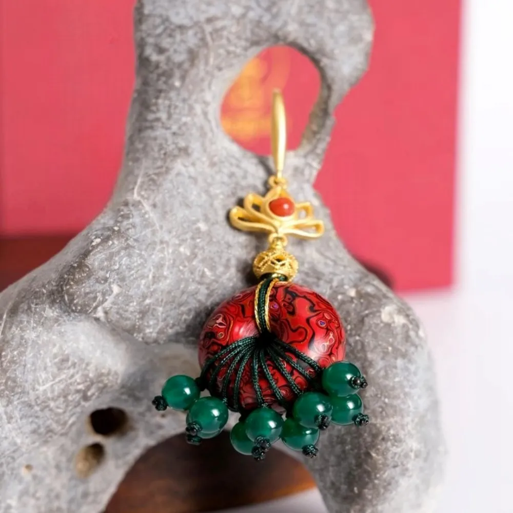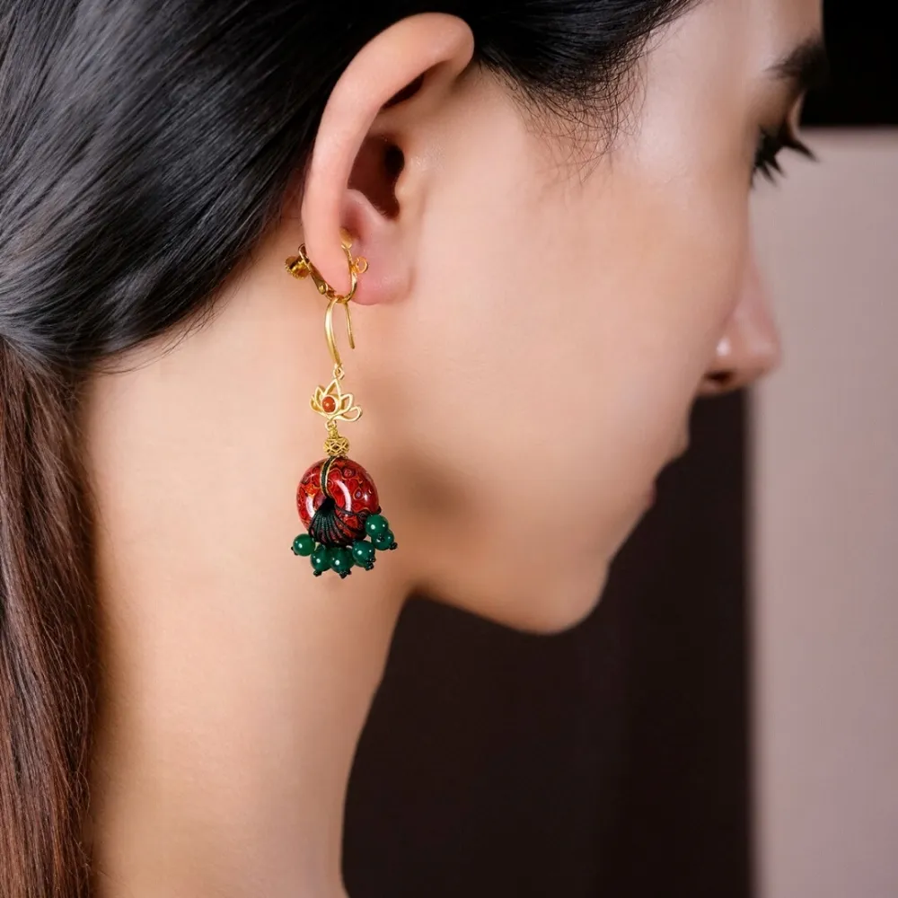 The Crimson Green Mist Lacquer Earrings are like a delicate fairy resting near your ear. The lacquer, like wine aged through the passage of time, grows more intriguing with every glance; the opal dances like an ethereal spirit, dazzling with its radiant charm; the green agate shines like morning dew, fresh and elegant; the gold accents glitter like stars, radiating luxury. Together, they form a harmonious symphony of Eastern beauty, evoking a sense of wonder and admiration.