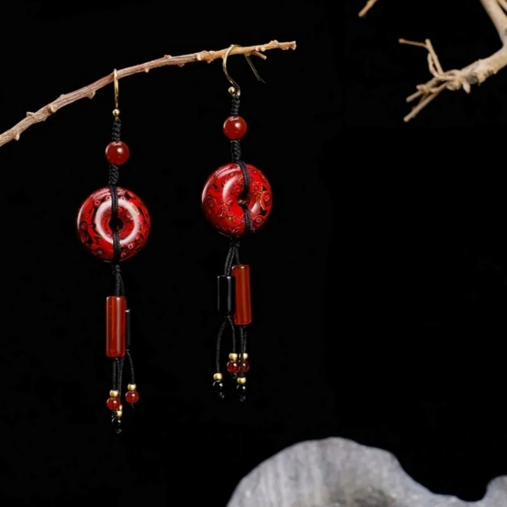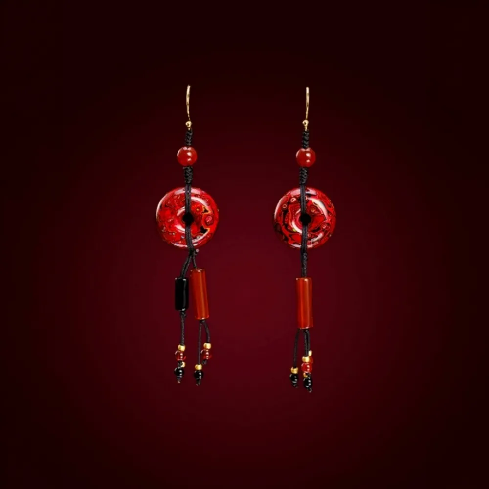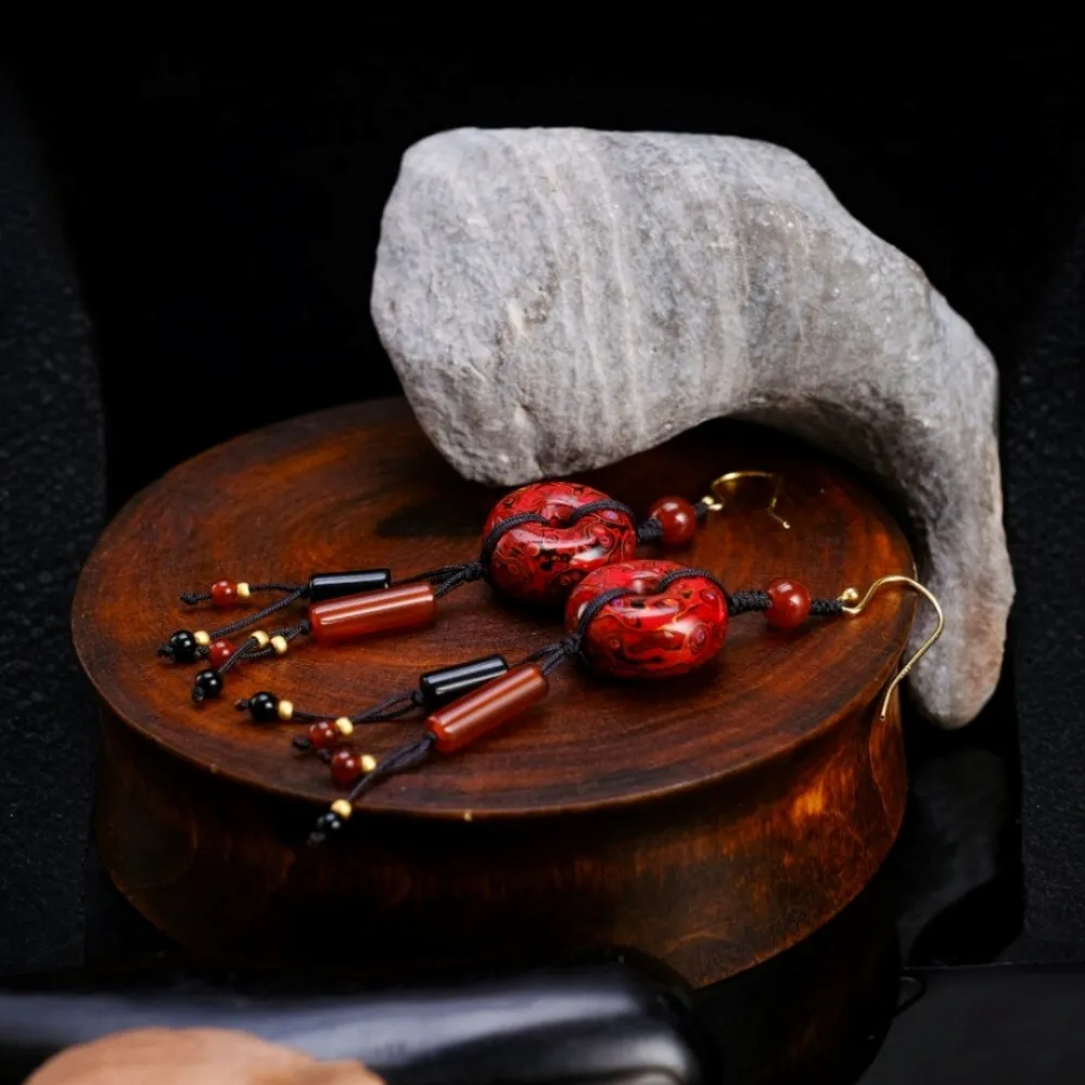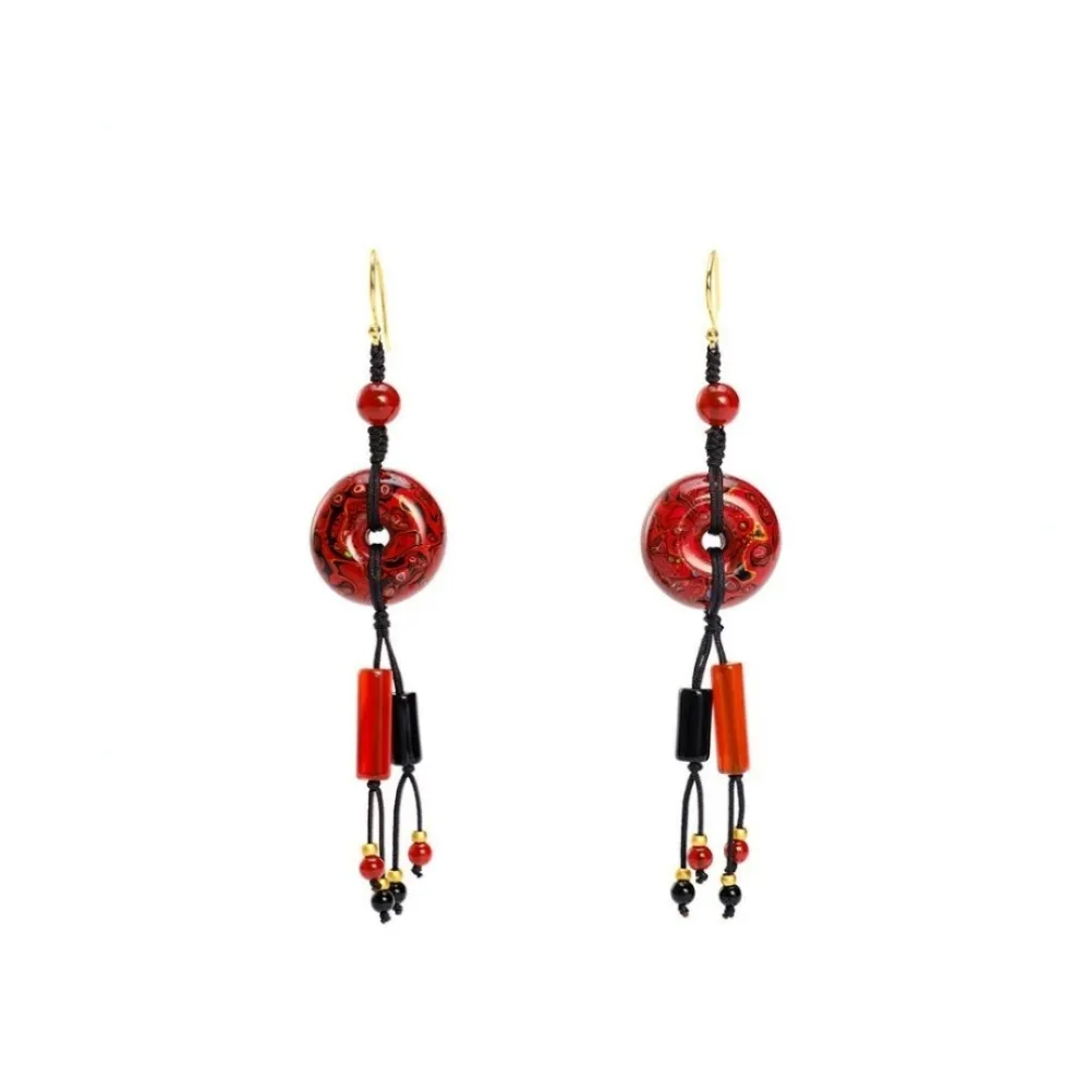 Adorned with red and black agate accents, the striking color contrast adds an elegant touch to the design. Handcrafted with lacquer, each earring is unique, forged through intricate processes that create a firm yet lightweight texture. When worn, the earrings sway with the wearer, allowing the beauty of this intangible heritage to bloom, infusing your style with a sense of ancient grace and cultural richness. They tell the story of Eastern elegance and a beautiful future.