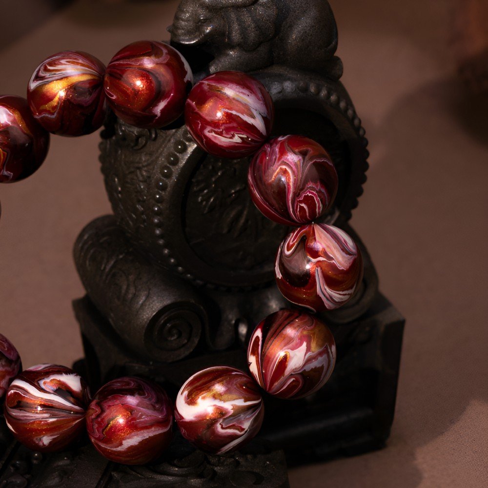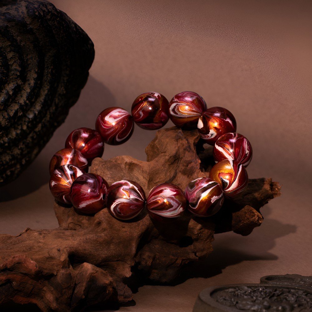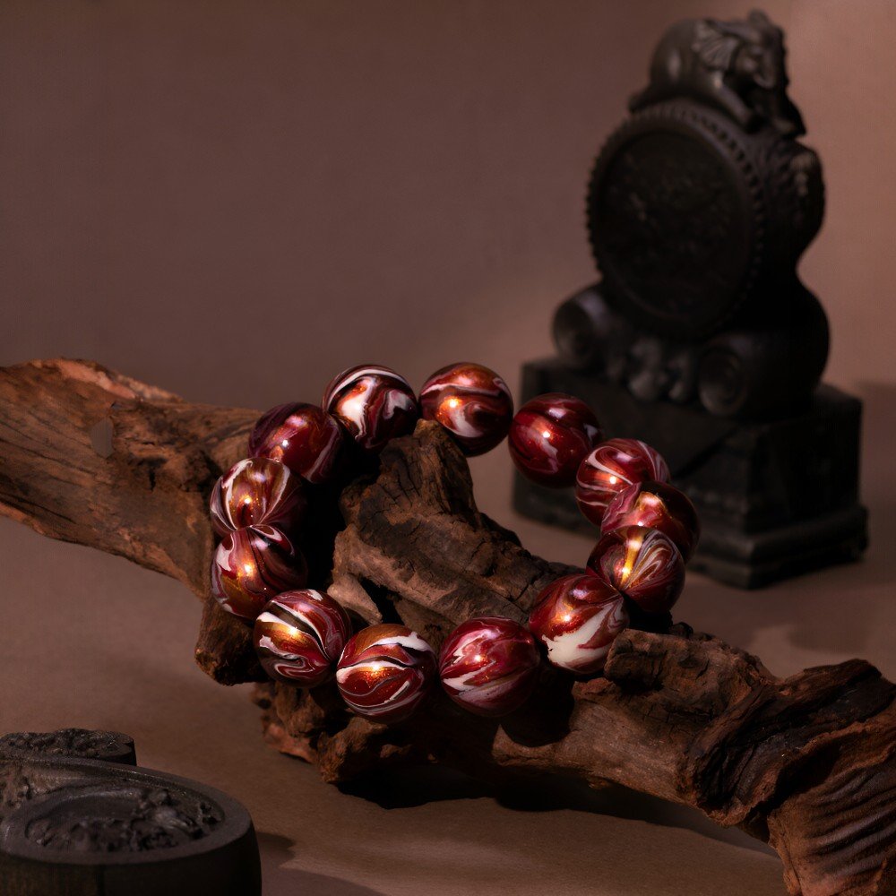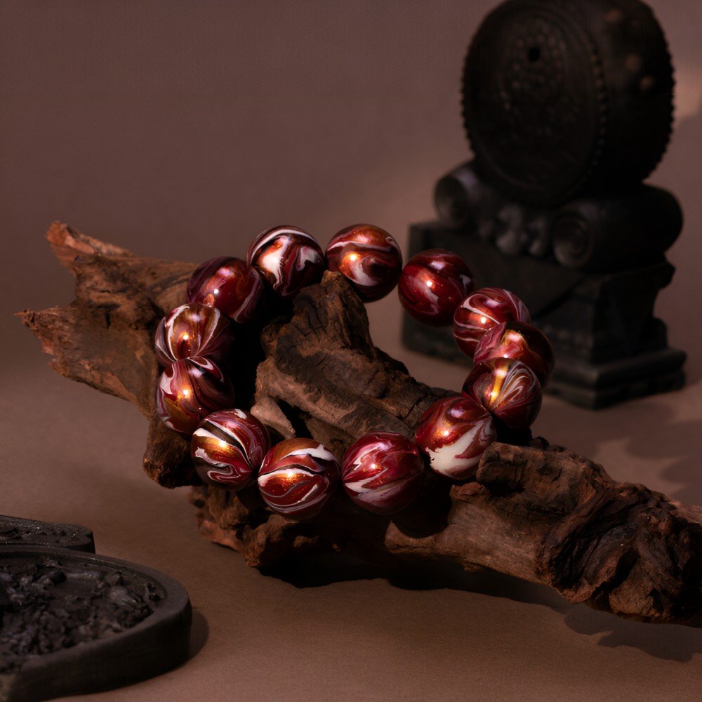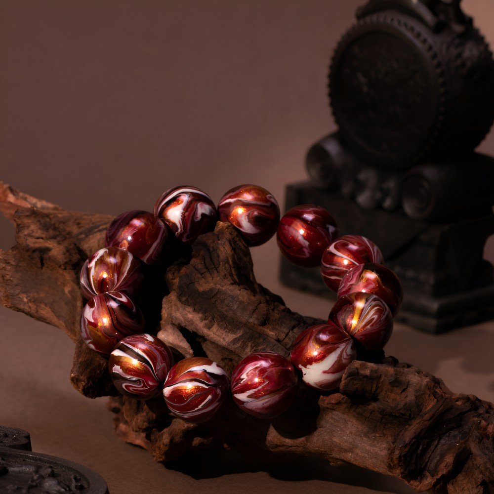 The bracelet features red and gold patterns like the unfolding pages of Han history. Deep red, like the majestic Weiyang Palace or the loyal blood of Han warriors on the battlefield; shining gold, like the Han Dynasty’s glorious territory or the cultural splendor of the Silk Road. The lacquer finish gives each bead a warm luster, each pattern carved by history – like the ancient patterns of Han roof tiles or the sharp edge of a Han sword, each bead holding the Han Dynasty’s awe-inspiring power.