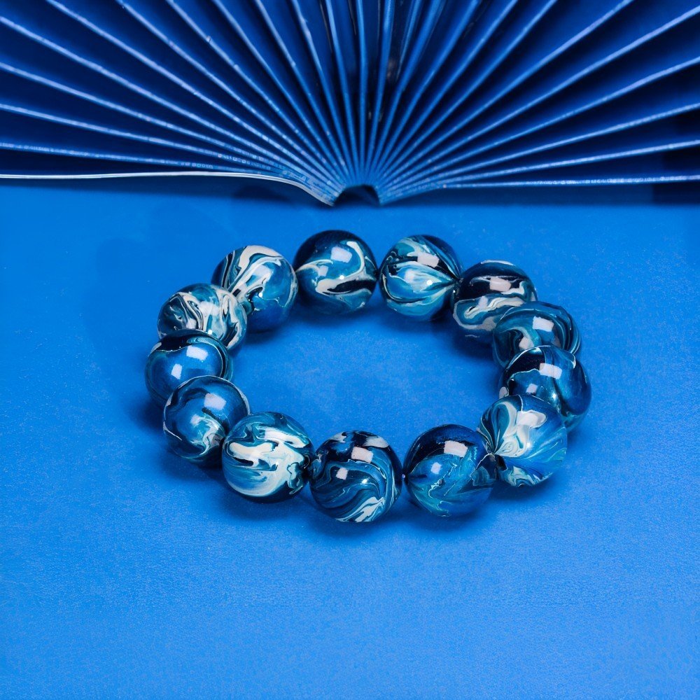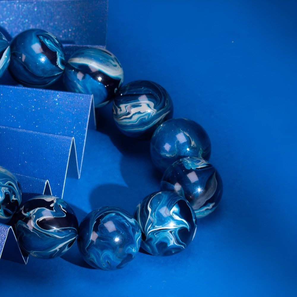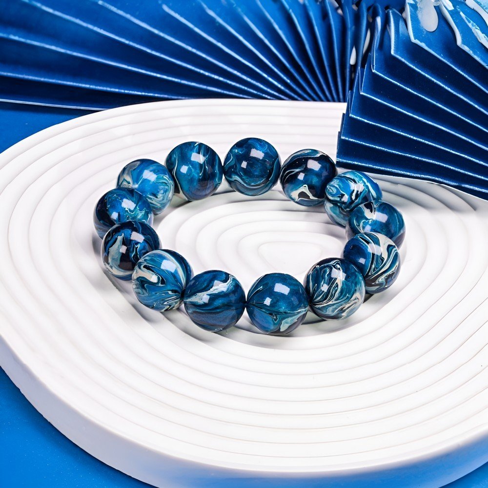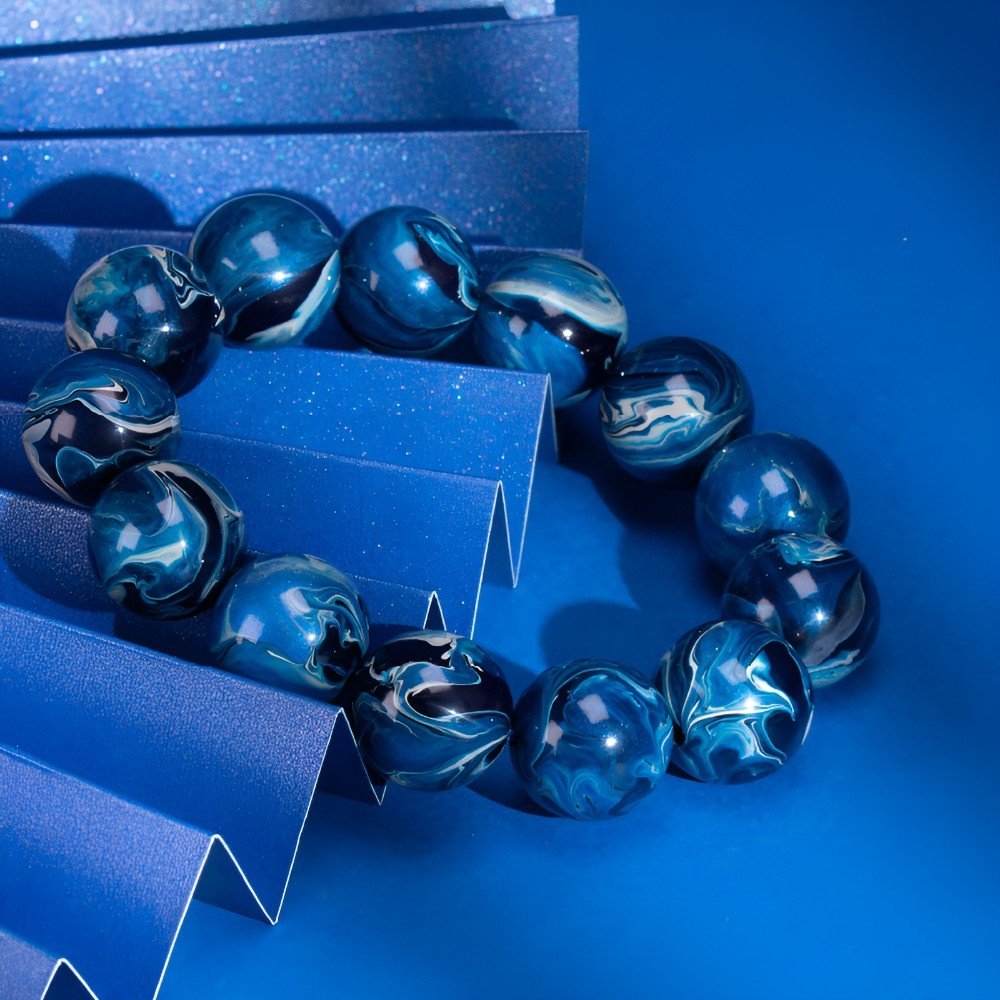 The bracelet’s main color is a deep blue, like the vast sky at dusk, profound and mysterious, as if containing countless unknown stories. This rich blue has a magical power, instantly drawing people’s thoughts away from the complex daily life, leading to a quiet spiritual corner, forgetting the noise and disturbance of the outside world. The faintly visible gray-white patterns are like leisurely drifting clouds in the night sky, light and free. These patterns are distributed irregularly on the beads, casual and unrestrained, like the unfettered thoughts in lazy times, spreading freely.