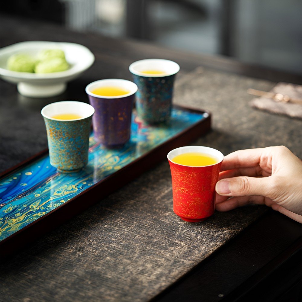 The Iridescent Lacquer Aroma Cup, crafted with lacquer as its medium, paints a vibrant artistic poem on the cup, transforming each sip into an elegant journey through time. Carefully selected blanks undergo 30 days of meticulous craftsmanship, with dozens of lacquer layers creating a mesmerizing blend of colors. Red like the morning glow, blue like the deep sea, purple like rosy clouds, complemented by winding gold patterns like a celestial river. Each lacquer texture shimmers under light and shadow, as if capturing countless streams of light within the cup. Holding it in your hand is like grasping a piece of flowing brilliance. The lacquer rhinoceros hide technique gives the cup a unique texture, with a smooth surface that becomes increasingly lustrous with use, witnessing the shared growth of time and object.