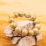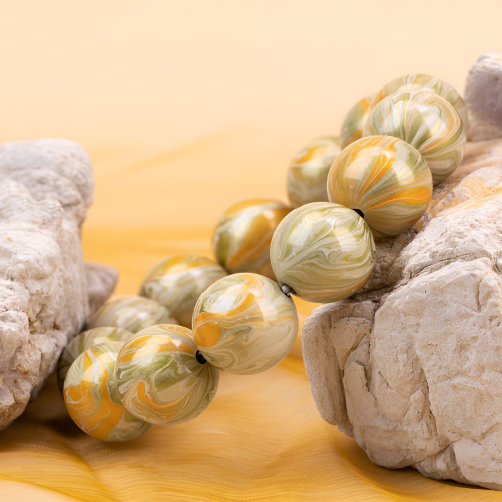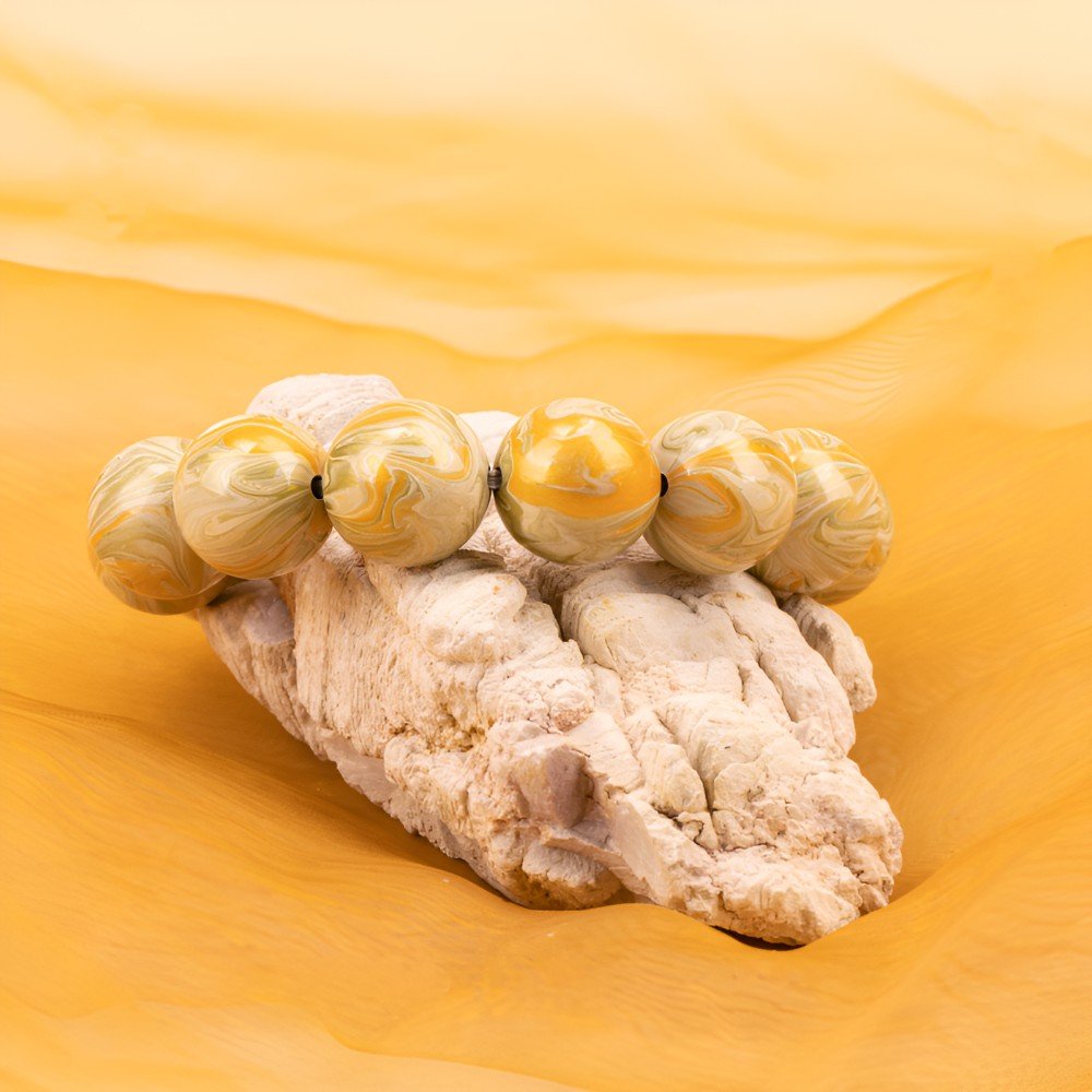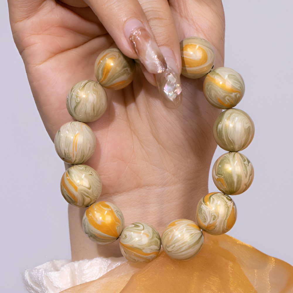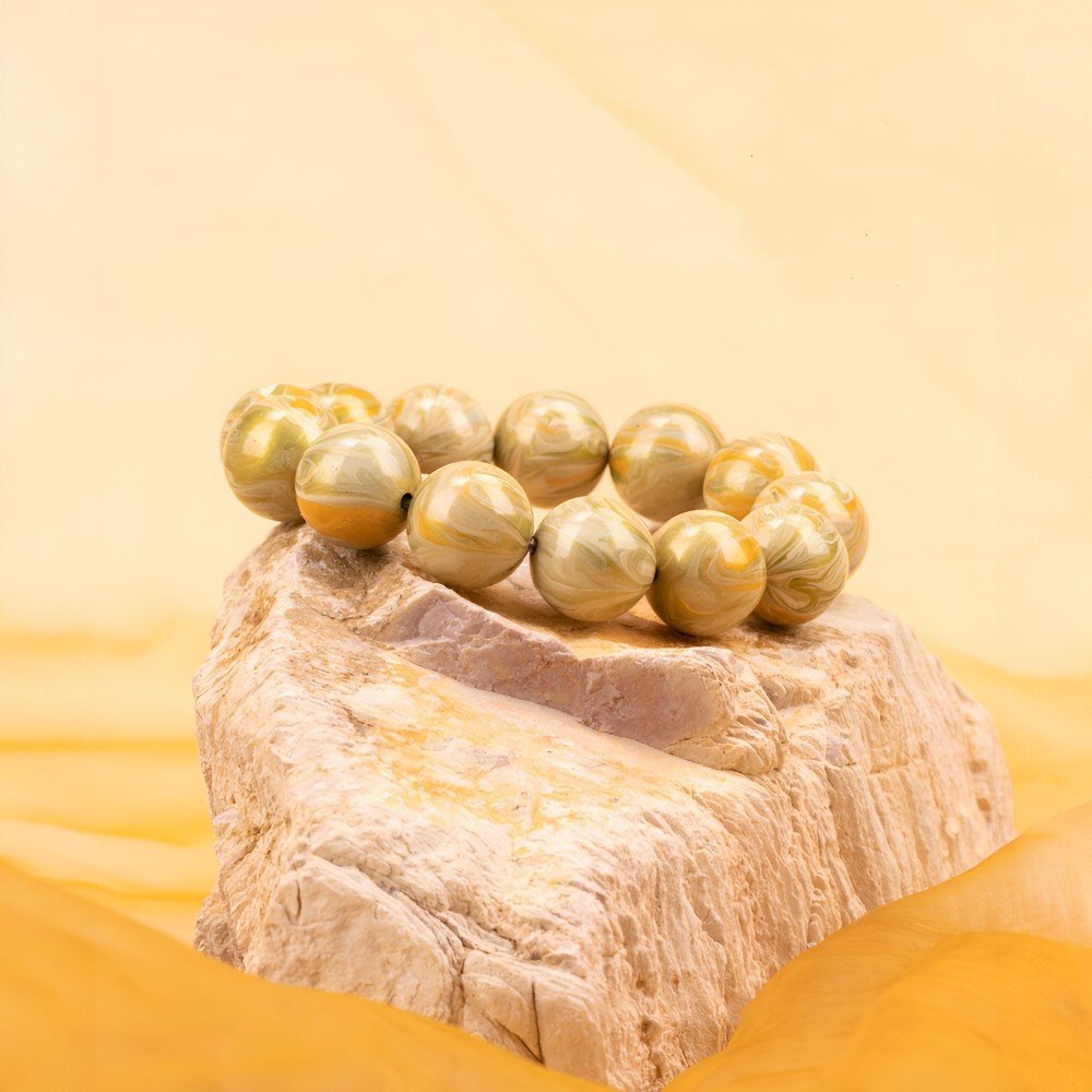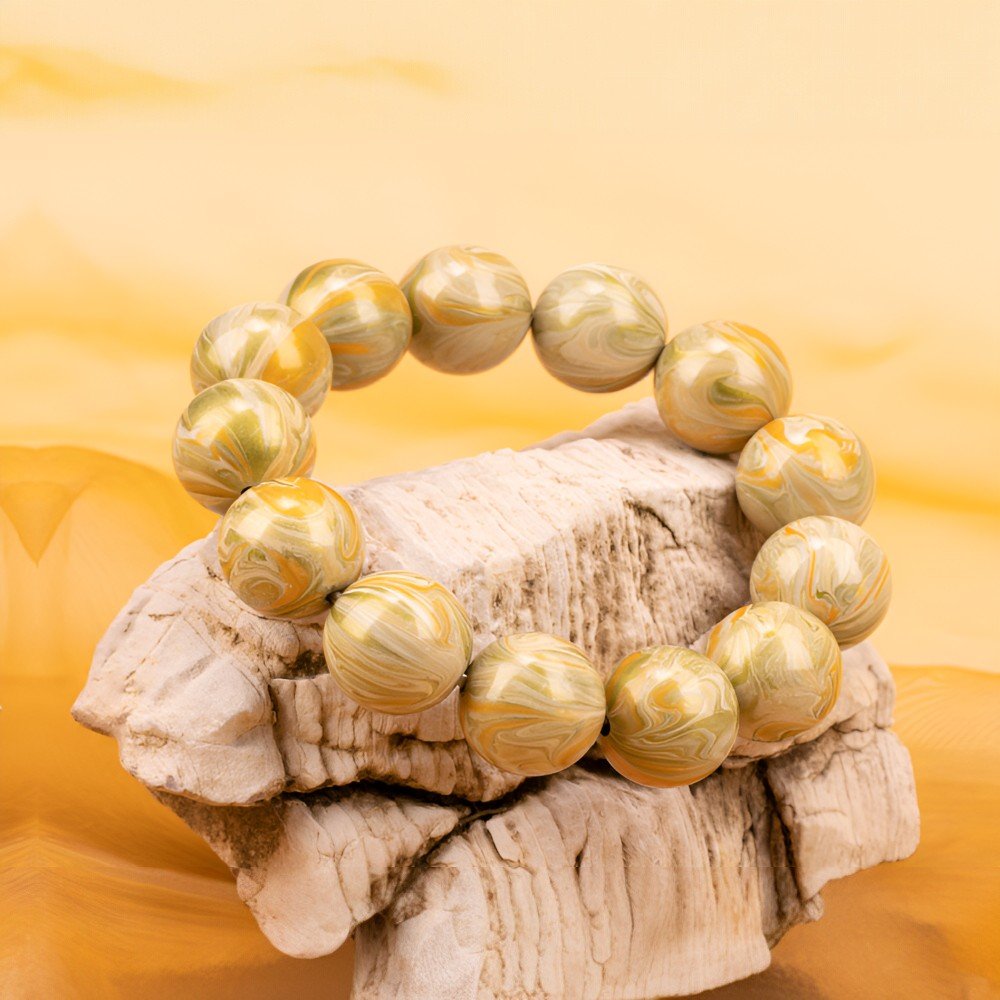 The bracelet’s dominant deep, textured gray-green hue mirrors the wind-eroded landscapes of Dunhuang, embodying the resilience of this ancient land. Intertwined within are subtle patterns of pale gold and white, reminiscent of sunlight piercing through the dust, bringing life to the ancient terrain. These patterns also echo the faded gold and limestone of Dunhuang murals, adding a touch of mystical brilliance.
