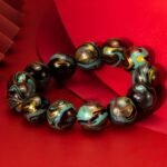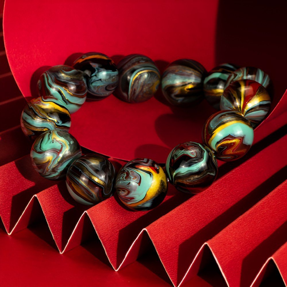 The bracelet features hues of green, gold, and red, as bold as Peking Opera masks. Deep green replicates the valor of Dan Xiongxin, embodying the spirit of chivalry; radiant gold mirrors the divine majesty of Erlang Shen, evoking mythical beauty; rich red inherits Guan Yu’s unwavering loyalty, expressing ardent passion. The lacquer finish gives each bead a warm glow, each flowing pattern like the brushstrokes of an opera artisan—either the bold strokes of an angry gaze or the flowing elegance of cloud patterns, each bead a miniature stage, showcasing the dedication of “one minute on stage, ten years of practice.”