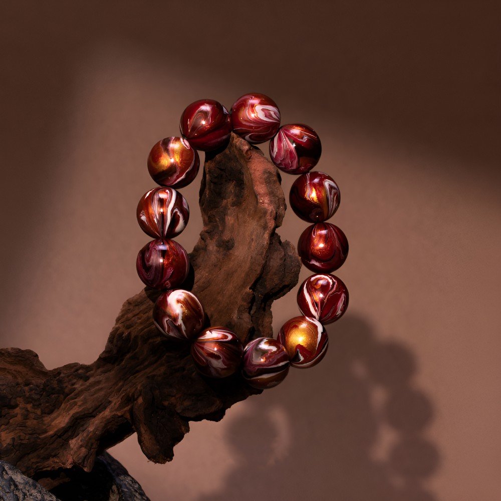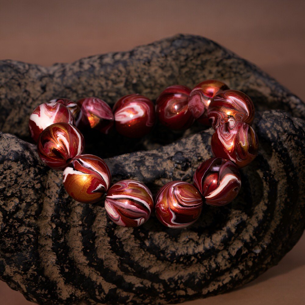 Lacquer gives the bracelet a warm luster, like a time-honored treasure. Gazing at the beads, landscapes come to life, echoing ancient voices and reverence for nature.