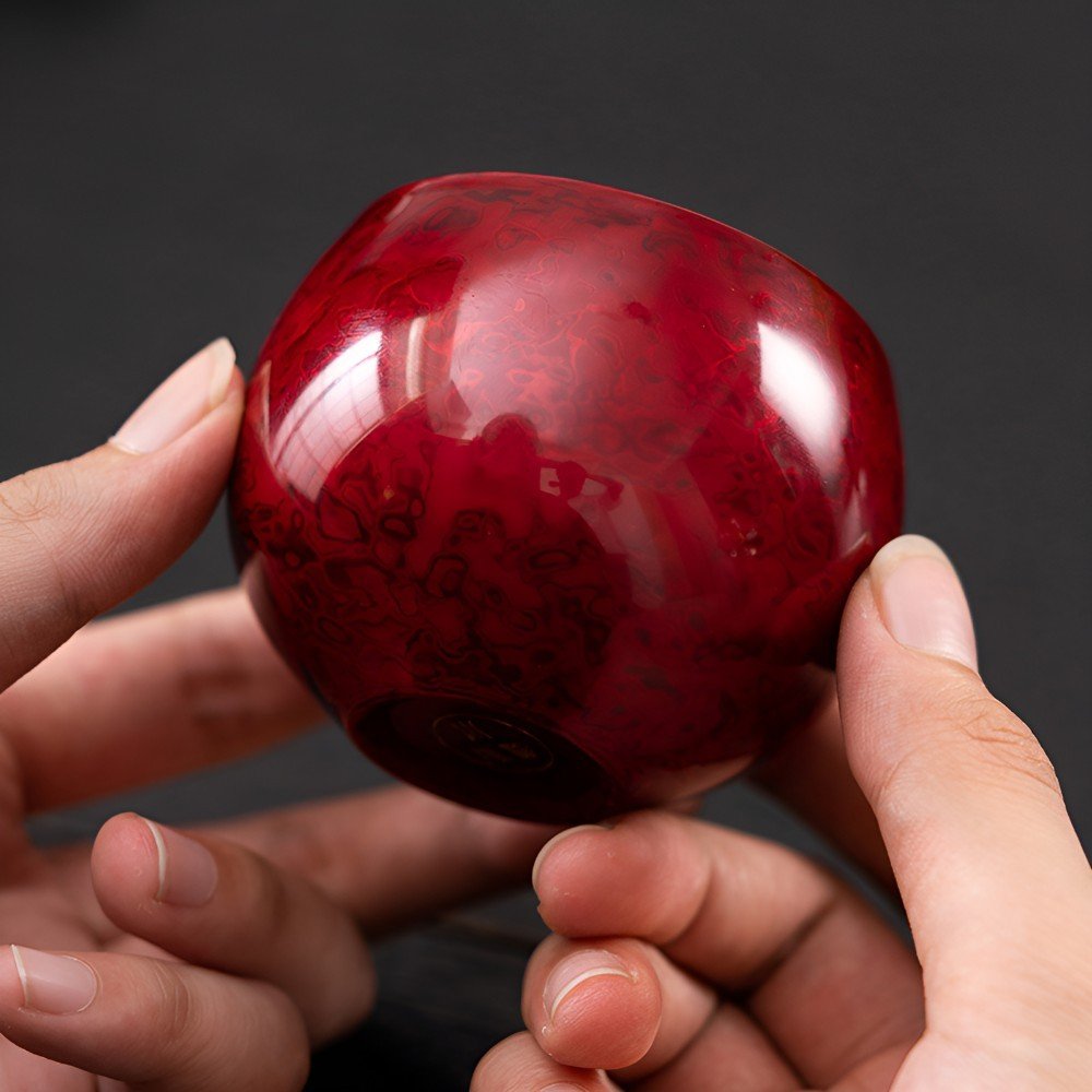 Its smooth, rounded silhouette, cradled in your palm, evokes the gentle warmth of a full moon, conveying the tactile essence of ’roundness and fullness.’ The deep, rich red, achieved through layers of lacquer application, resembles time-worn cinnabar or a sunset painting a scene of completeness. Each cup boasts unique natural lacquer patterns, reminiscent of blooming flowers or swirling galaxies, embodying the spirit of nature and the pursuit of a perfect life in Eastern culture. The lacquer’s surface, growing more lustrous with use, mirrors the tranquil completeness gained through life’s experiences.