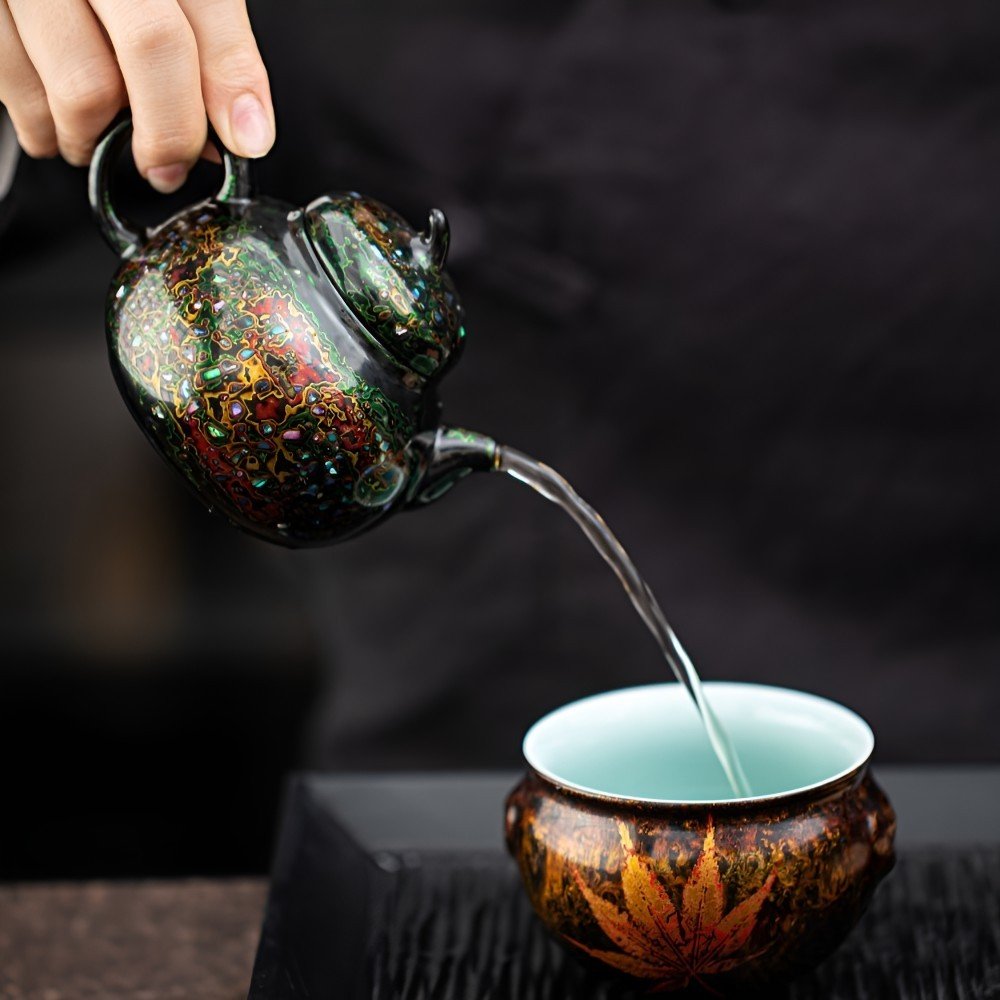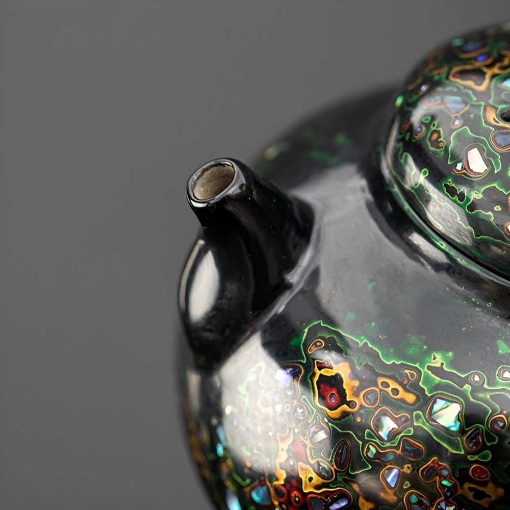 Discover the Starlight Lacquer Pear Teapot, a blend of national intangible cultural heritage mother-of-pearl lacquer art and pear-shaped elegance, Experience celestial beauty and artisan craftsmanship.