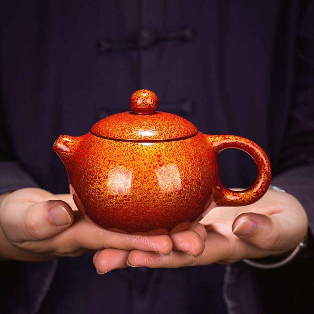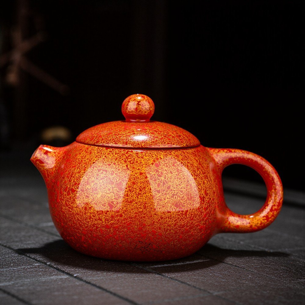 The Starlight Lacquer Pear Teapot, with the national intangible cultural heritage of mother-of-pearl lacquer craftsmanship as its soul, adopts the elegant pear-shaped body, integrating traditional aesthetics and artisan skills. Selected high-quality clay forms the base, layered with mother-of-pearl lacquer rhinoceros hide techniques. Where lacquer colors intertwine, mother-of-pearl fragments scatter like stars. The blue-green style resembles a starry river in a quiet night, while the red-gold style is like radiant sunset glow. Each flowing texture is a unique artistic masterpiece refined by time and craftsmanship, allowing intangible cultural heritage charm to shine on the vessel.