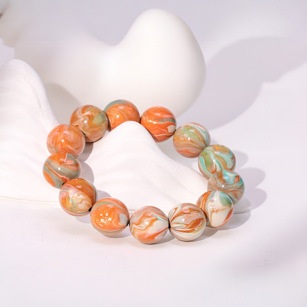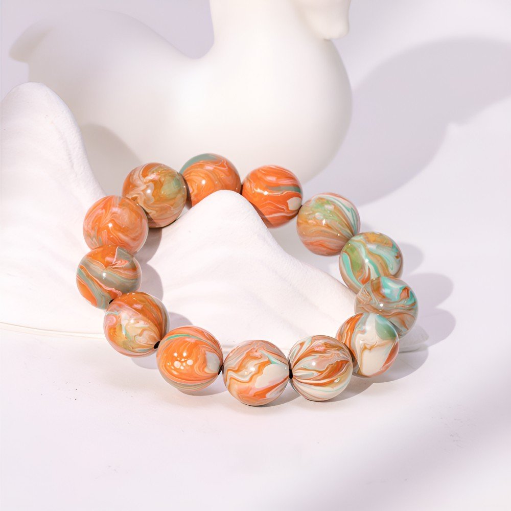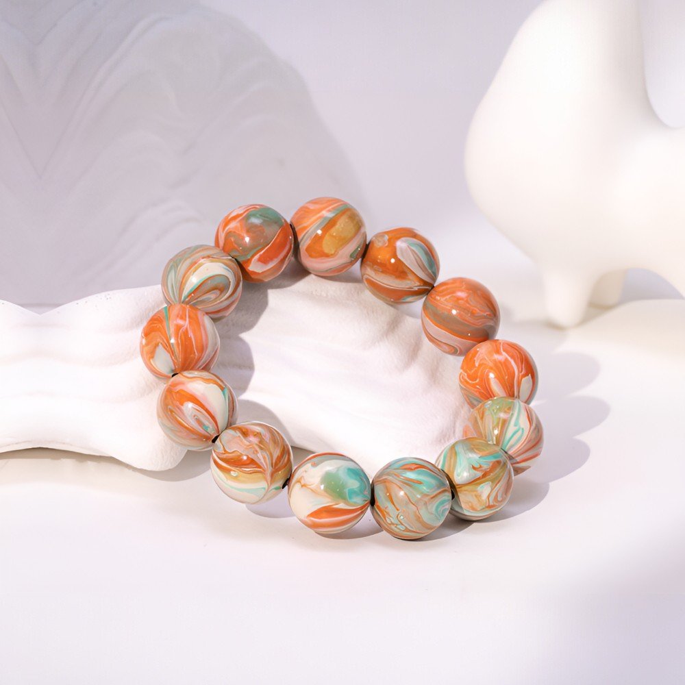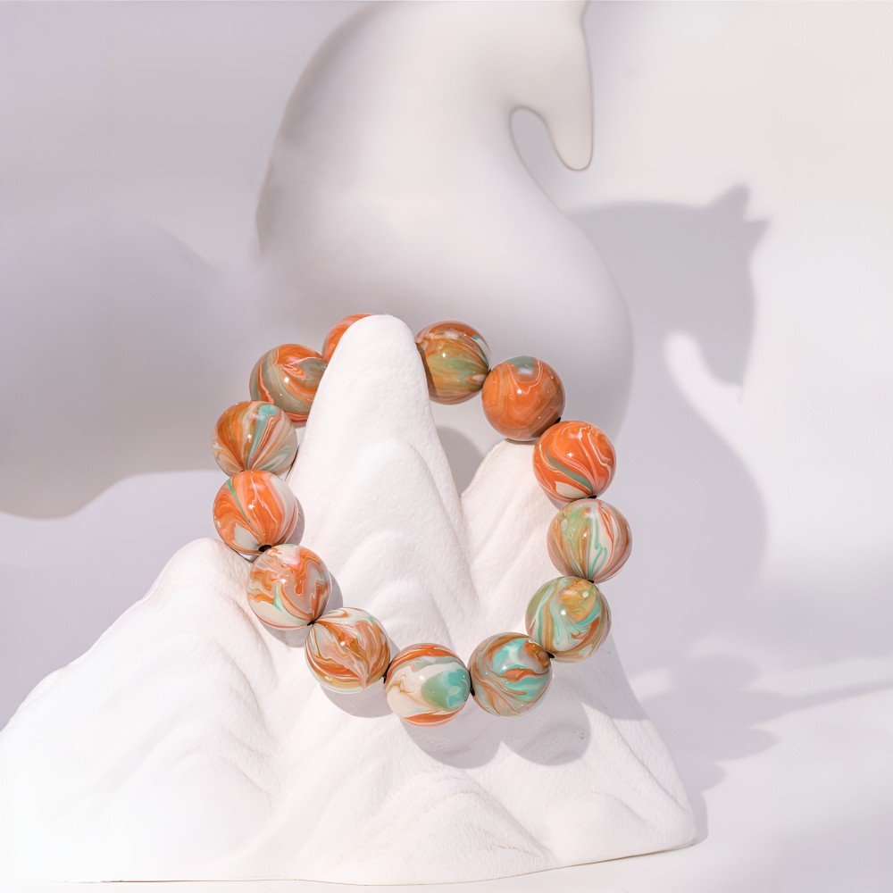 The bracelet features hues of orange, green, and white, unfolding like a Tang Dynasty painting. Bright orange, like the ever-lit lamps of Chang’an’s maritime trade, or the whirling sleeves of the Hu Xuan dance; clear green, like the verdant Zhongnan Mountains or the willow-lined Qushui River; pure white, like the elegant Tang-style skirts, symbolizing the dynasty’s inclusive spirit. The lacquer finish gives each bead a warm glow, each pattern like an artisan’s brushstroke, reminiscent of Wu Daozi’s flowing lines or Tang tri-color pottery, weaving the dynasty’s splendor into your wrist.